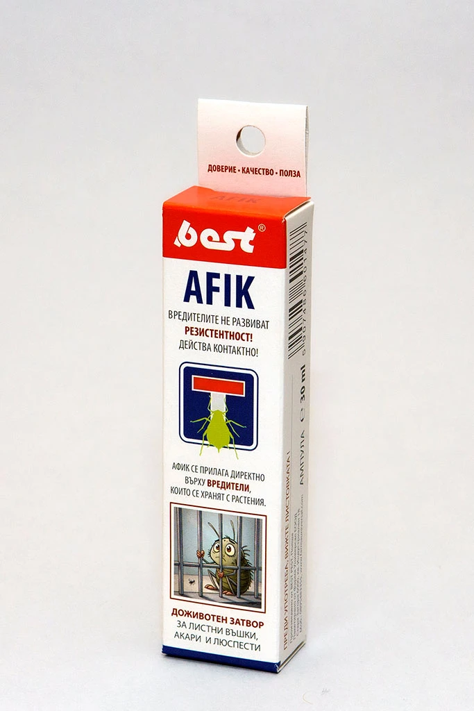 Механизмът на действие на АФИК е чисто физически.След пръскане вредителите залепват и умиратот задушаване до 95% от популацията.Крайният резултат е изключително висок спрямо химичните продукти.Светкавичен ефект -много голяма част умират веднага по време на пръскането,а останалите в рамките на следващите 24-48ч.