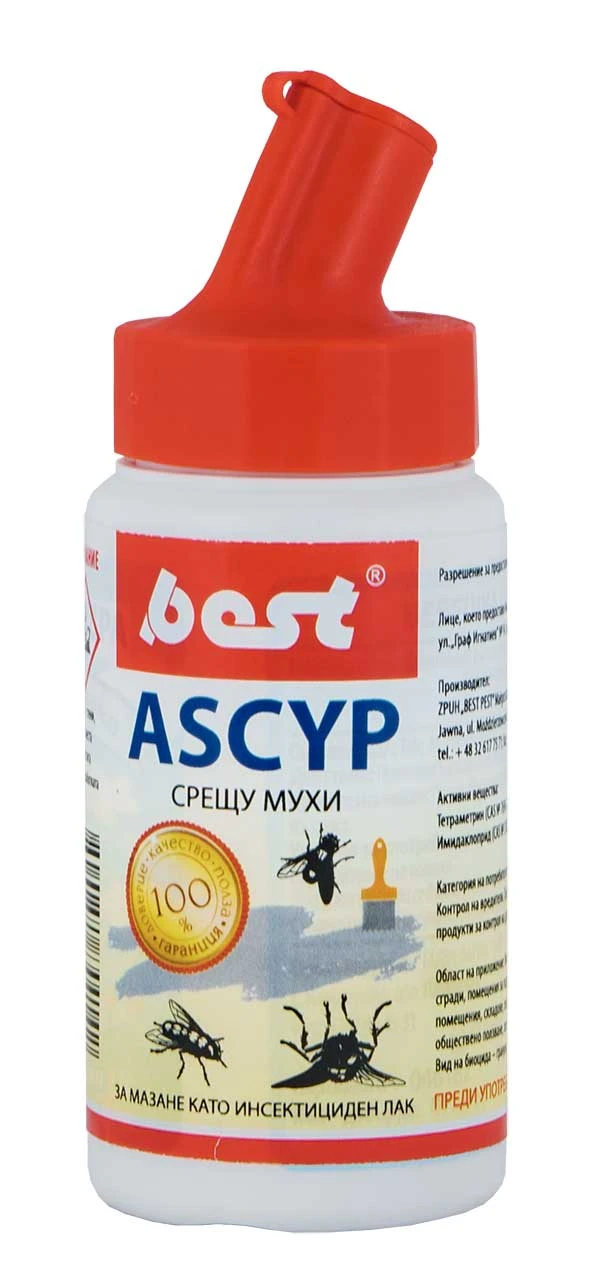 Подготовка на работна суспензия: в подходящ съд смесете 30 g ASCYP срещу мухи с 30-40 ml топла вода, разклатете добре, за да получите хомогенна, лепкава суспензия.