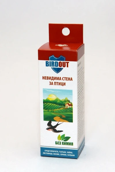 BIRDOUT е с мощен отблъскващ ефект за птиците.Вкусът и миризмата му са много неприятни за птиците/врабчета,гълъби,чайки,лястовички,косове,свраки,гарвани/не им вреди,но ги прогонва от мястото на приложение.