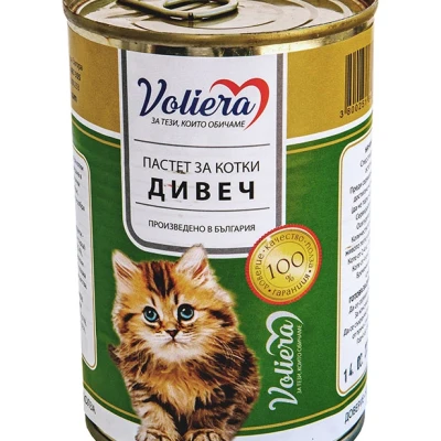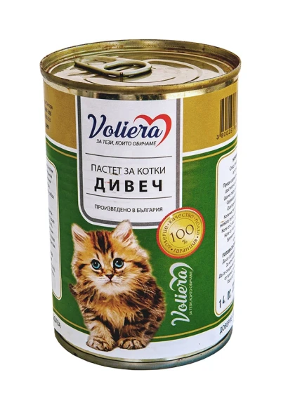 Производител: Фарма Универсал ЕООД,Стара Загора.Произведено в България.Пълноценна балансирана храна за котки с ограничена активност, отглеждана в домашни условия.Доставя всички необходими протеини,фибри,витамини,минерали и мазнини за добра здравословна форма.Състав:Дивечово месо и месни субпродукти-70%МОМ,пилешки бульон 25.4%,животински протеин 1,7%,желатин 1,7%,хемоглобин на прах 0,1%,плазма на прах 1,1%.Непредназначен за консумация на хората!Аналитични съставки: сурова пепел-1,39%,влага-79,01%,мазнини- 6,42%,протеин-11,93%,влакнини-1,39%. Нето тегло:е 0,410 кг.