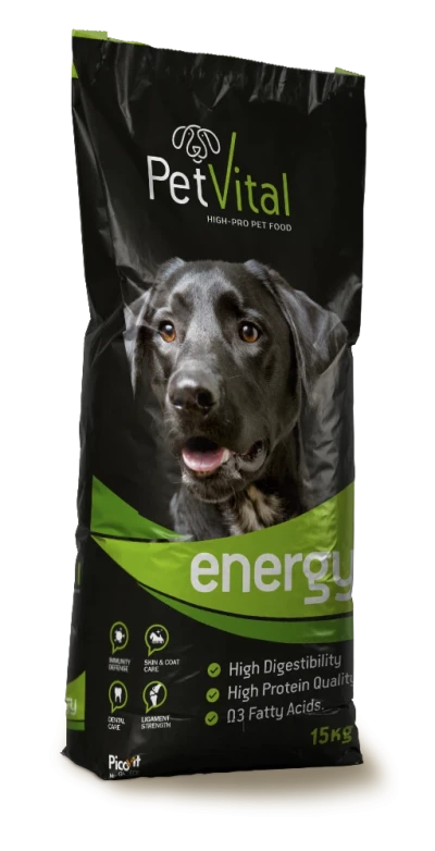 PET VITAL ENERGY е специално разработена пълноценна и балансирана храна за кучета с нормални до високи енергийни нужди. Перфектен избор за изложбени кучета, ловни породи, както и за бременни и кърмещи женски. Формулата ѝ е създадена, за да поддържа оптималната форма, издръжливост и здраве на вашия любимец.