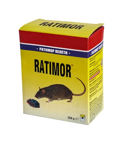 Ратимор пелети са с активна субстанция бромадиолон. Произведени от смлени зърнени производни. Те са екструдирани, което спомага за лесното и бързо смилане и усвояване от гризачите. Готовата примамка е с еднаква „отровна плътност”, тъй като активната субстанция е впръскана в пелетата. Добавените атрактанти и вкусовите и качества я правят предпочитана от плъховете и мишките пред обикновената зърнена примамка. Ратимор пелети съдържат 5% парафин. Това спомага за запазването на пелетата хрупкава и вкусна използвана при влажни помещения. Те не мухлясват и не губят своите свойства дълго време. Съдържа Битрекс, горчива съставка която предизвиква повръщане при неволно поемане от хора и домашни любимци и мумифицираща смес, която предизвиква изсъхване след смъртта за да няма неприятна миризма.